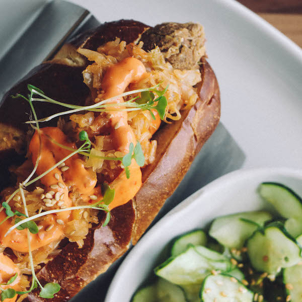 The house-smoked vegan curry hot dog comes on a pretzel bun with cucumber sunomono relish, sesame seeds, and Chinese grain mustard. Courtesy photo